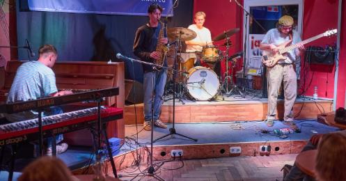 Am Freitag Abend eröffnete ein junges Quartett aus Österreich das abwechslungsreiche Musikprogramm. Der Bandhame Roundabout war dabei gleichzeitig das Programm. Wie im Kreisverkehr kamen musikalische Einflüsse aus mehreren Richtungen herein, die Ergebnisse finden jeweils ihre Ausfahrten. Die Einfahrten repräsentierten dabei unter anderem Neo-Soul, R'n'B und Nu Jazz. Mittlerweile spielt die Band nur noch Eigenkompositionen und geht mit ihrem Album Sidequest einen ganz neuen Weg, verriet Manù Kreutzer dem Publikum. Er war es auch, der auf dem Saxophon den musikalischen Reigen eröffnete. Ihm schlossen sich Moritz Lindner an den Drums, Henrik Höllinger am Bass und Alexander Danninger an Keyboard und Piano an. Oftmals melancholisch beginnend, nahmen die Stücke schnell Fahrt auf und endeten nicht selten abrupt. Den Applaus des Publikums fanden sie damit problemlos.