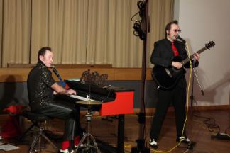 Diese mitreißende Mischung packten die beiden Musiker in eine atemberaubende Show, der Gitarrist mit gekonntem Hüftschwung wie ehedem Elvis, der Pianist – zudem auch zuständig für Percussion und Bluesharp – mit atemberaubend rasanter Fingergymnastik. Eigentlich waren ihm manchmal fast nicht genug Tasten auf dem Instrument, es wäre sicherlich rechts und links auch noch weitergegangen. Gerne schlug er auch mal den letzten Ton mit der Ferse an oder legte ein Bein auf’s Piano und spielte darunter weiter, als sei dies die natürlichste Sache der Welt. Das Publikum war schlicht hingerissen, der lange Applaus forderte zwei Zugaben, zuerst in furiosem Tempo My blue suede shoes, danach als sanfter Ausklang des Abends What a wonderful world.