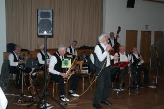 Die Band trat mit fünf Musikern in der Bläserreihe auf – Bernd Güthoff am Saxophon, Erich Tietzel an der Posaune, Karsten Fischer und Freddie Ernst für Trompete und Flügelhorn und Wilfried Steinmetz an der Klarinette. Auch die Rhythmusgruppe war mit zwei Banjos – Wulf Weilinger und Heiner Struck, mit Roland Berthold am Schlagzeug und Holger Fischer am Kontrabass für das solide Fundament hinreichend bestückt. Ob getragen langsame Titel, ob Rag, traditioneller Gospel, schwungvolle tanzbare Stücke oder bekannte Evergreens der Jazzwelt – die Band meisterte sie alle. Gelegentlich wurden von einem Solisten Fetzen anderer Melodien unter einen Song gemischt, gerade lang genug, dass es auffiel. Nach den bevorzugten und liebsten Soli gefragt, votierte das Saxophon für „All of me“, die Klarinette für den „Savoy Blues“, das Banjo für den „Royal Garden Blues“, die Posaune für das sehnsuchtsvolle „Do you know what it means to miss New Orleans“, eine Trompete wählte das schwungvolle „At the jazzband ball“, die andere für’s Gefühl „When you’re smiling“ , der Kontrabass nahm den „Weary Blues“ und das Schlagzeug „Down by the riverside“.