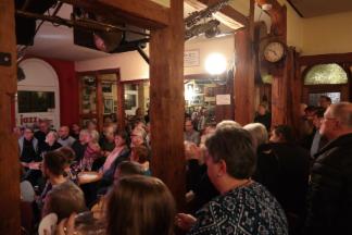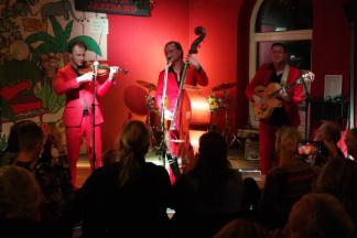 Außerordentlich viele Gäste konnte der Jazz-Club zum Konzert am „dritten Feiertag“ begrüßen, Jazzfans von neunzehn bis neunzig. Da der Saxophonist der Band wegen Krankheit absagen musste, spielten „The Busquitos“ aus den Niederlanden an diesem Abend als Trio – gekleidet in Weihnachtsmann-Rot. Der überaus virtuose Geigenspieler Jelle van Tongeren, der Gitarrist Daniel Versteegh und der fantastische Sänger und Kontrabassist Ronald de Jong ließen das fehlende Saxophon rasch vergessen und begeisterten mit Spielfreude, einer abwechslungsreichen Auswahl an Titeln und perfekt aufeinander abgestimmter Präsentation. Launige Ansagen und Showelemente, ein Sänger mit rauer Stimme und ab und an ein mehrstimmiges Gesangstrio rundeten die Sache ab.